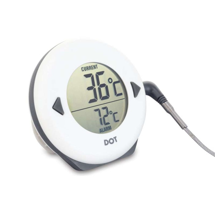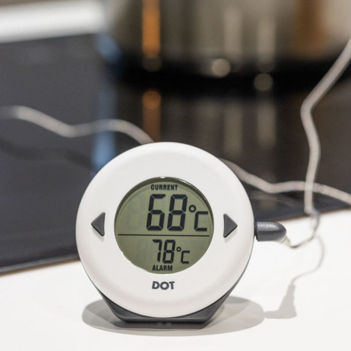 De DOT Digitale Oven Thermometer is een gebruiksvriendelijke thermometer die zowel de huidige temperatuur als de ingestelde doeltemperatuur weergeeft. Stel eenvoudig de gewenste temperatuur in met de toetsen, plaats de sonde in het voedsel en de DOT geeft een signaal: het display knippert en het alarm piept zodra de ingestelde temperatuur is bereikt.