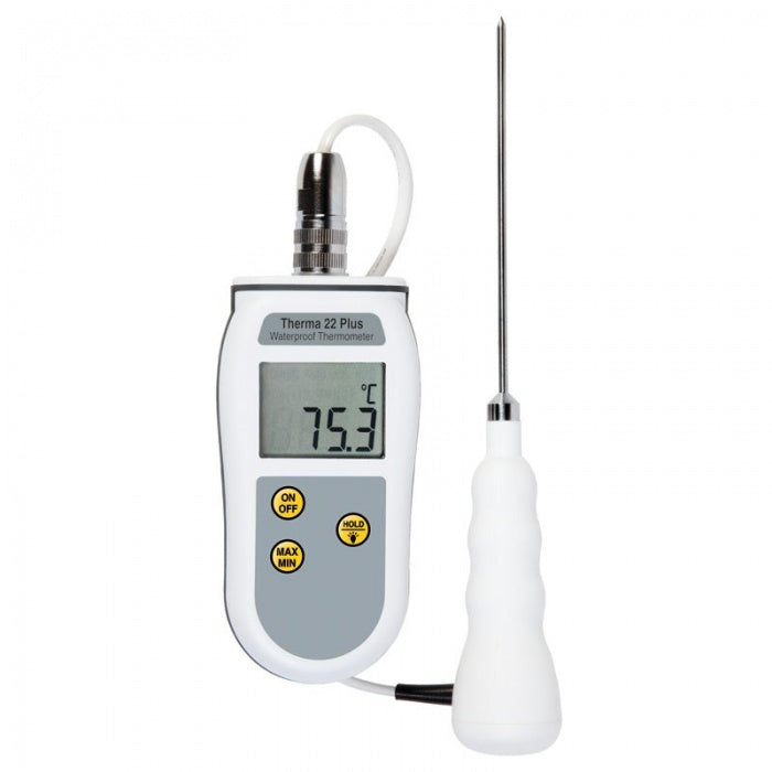 De Therma 22 Plus is een robuuste en waterdichte digitale thermometer speciaal ontworpen voor professionele voedselverwerking, HACCP-controles en industriële toepassingen waarbij betrouwbaarheid en hygiëne essentieel zijn. Dankzij de IP66/67-certificering kan dit meetinstrument onder water worden gespoeld of zelfs ondergedompeld worden, wat schoonmaken eenvoudiger maakt in veeleisende omgevingen.